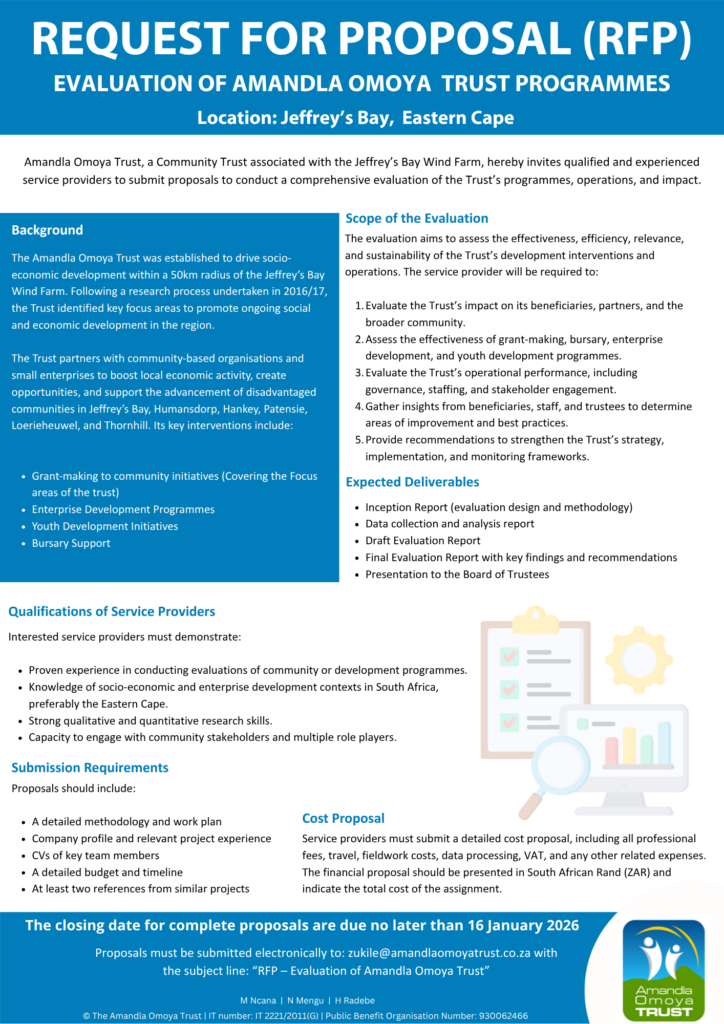 Amandla Omoya Trust is seeking qualified service providers to conduct a full evaluation of its development programmes, including grant-making, enterprise development, youth initiatives, and bursaries. The evaluation will assess the Trust’s impact, effectiveness, and operations, and provide recommendations for future improvement. For full details, please see document below: